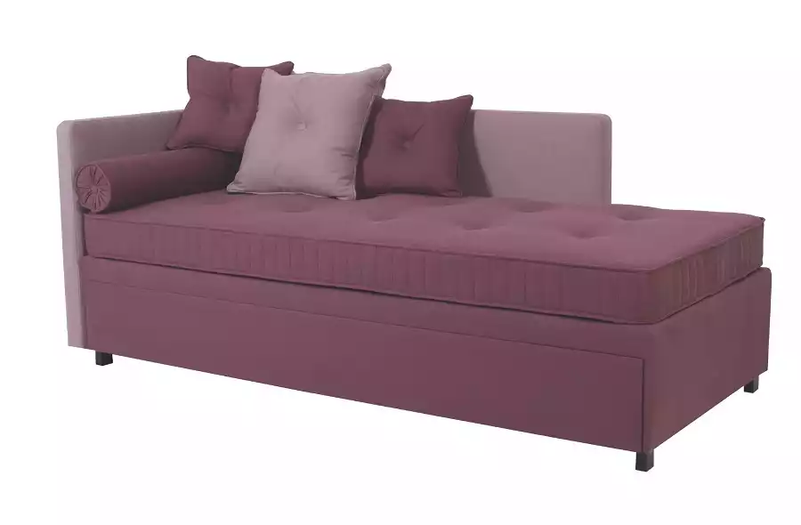 Facile de s’allonger sur cette méridienne qui possède un deuxième lit caché dans son dispositif inférieur, monté sur une structure de métal que l’on peut hisser à hauteur du canapé. Et voici un lit deux places !